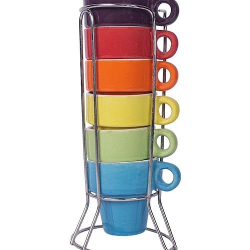 Embalagem Contem:º 06 Canecasº 01 SuporteMedidas Suporte:º Altura: 16,5 cmº Diâmetro Base: 8 cmº Diâmetro Superior: 6,5 cmº Capacidade: 6 XícarasMedidas Xícaras:º Altura: 5,5 cmº Diâmetro Boca: 6,5 cmº Diâmetro Base: 3,3 cmº Capacidade: 50MLMaterial:º Aço Inoxº Cerâmica