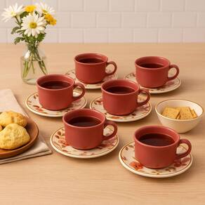 Produzido em cerâmica de alta resistência, o conjunto traz seis xícaras com capacidade perfeita para servir o chá com conforto, acompanhadas de seis pires que completam a experiência com elegância. Seu design delicado é valorizado por detalhes modernos e acabamento refinado, transformando cada encontro em uma ocasião única e acolhedora.
