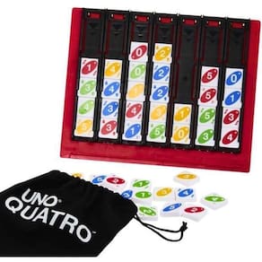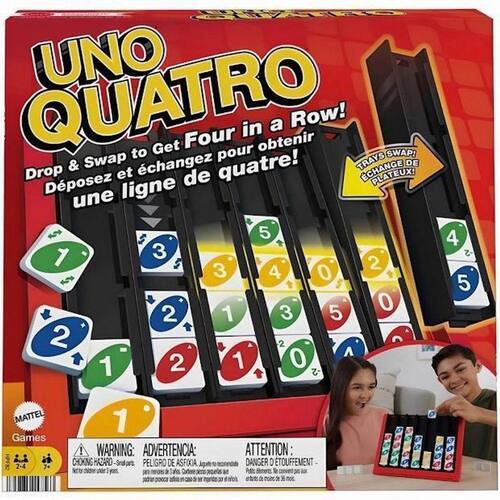 Os fãs dos jogos de cartas uno vão adorar o jogo para toda a família uno Quatro, que une o desafio de conseguir quatro peças em uma linha com a estratégia de combinar por cor ou número. Na sua vez, o jogador desliza suas peças em 1 das 7 bandejas, tentando manobrá-las estrategicamente para combinar quatro peças em uma linha. As peças devem tocar outra peça com a mesma cor ou número, já as Peças de Ação especiais mudam o jogo: elas fazem os outros jogadores ficarem com menos peças, uma peça ser empurrada para fora de uma bandeja, e até mesmo duas bandejas trocarem de posição é um excelente presente para fãs de uno e apaixonados por jogos a partir de 7 anos.