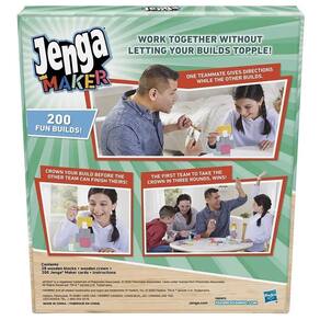 o jogo jenga maker é uma reviravolta frenética e divertida na jogabilidade clássica de jenga. Os jogadores se dividem em equipes e correm para construir seu objeto jenga usando os blocos de madeira jenga. Um companheiro de equipe descreve a configuração mostrada no cartão e, guiados apenas por sua descrição, os outros correm para construir e coroar sua criação. Mas cuidado se uma equipe construir errado ou fizer o objeto cair, eles terão que começar de novo. A primeira equipe a completar e coroar 3 builds vence