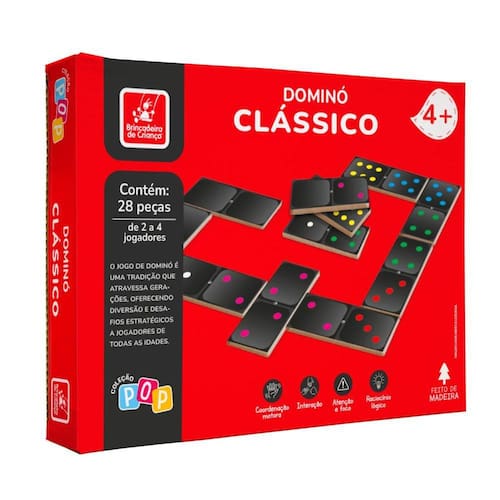 O Jogo Dominó Clássico é ideal para reunir amigos e familiares. Com esse dominó, as horas vão passar voando! Desafie os amigos e veja quem possui a melhor estratégia nesse jogo estimulante. Idade recomendada: A partir de 4 anos. Selo Inmetro: 006332/2021.