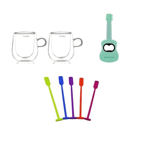 O conjunto de 2 canecas de vidro de borossilicato da Bugatti são ideais para saborear bebidas quentes ou frias, pois a parede dupla funciona como isolante térmico, conservando o calor da bebida sem transmitir o calor para as mãos, mantendo a temperatura quente ou fria por mais tempo. O seu formato arredondado na borda proporciona um toque especial, levando a delicadeza e leveza até a degustação. O jogo de 5 Peças de Mexedor para Coquetéis da linha Bar & Vinho da Prana é fabricado em polipropileno, material refinado de alta qualidade. O abridor de garrafas em formato de Guitarra da Prana Boêmio da linha Bar & Vinho da Prana é divertido e funcional, perfeito para abrir suas garrafas rapidamente. O kit inclui: 2 Canecas de 300ml 1 Abridor de latas 5 Mexedores Especificações das Canecas: Altura: 12cm Diâmetro: 8cm Capacidade 300ml Peso: 165g Material: Vidro Borossilicato Marca: Bugatti Especificações dos Mexedores: Altura: 16,5cm Largura: 1cm Peso: 40g Material: Polipropileno Marca: Prana Especificações do Abridor de Garrafa: Altura: 12cm Largura: 5cm Peso: 40g Material: Silicone e Aço Inox Marca: Prana Ean: 7894131756478
