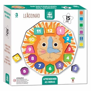 Jogo Educativo - Aprendendo as Horas - Leãozinho - Nig Brinquedos: atividade Montessori para a criança encaixar as peças, reconhecer as cores e as formas, aprender os números e as horas. Relógio e peças de encaixe em madeira de 9 mm de fácil manipulação pelas crianças, resistentes e coloridas. O Leãozinho tem 02 ponteiros que se movimentam para marcar as horas e dois suportes por trás para ficar inclinado e facilitar a brincadeira. Como brincar com Aprendendo as Horas da Nig? • Para brincar é muito fácil, basta achar as formas com números e encaixá-las em seu respectivos números. Cada peça tem seu encaixe próprio para facilitar a brincadeira e aprendizado. Informações: • Produto: Jogo Aprendendo as Horas Montessori • Marca: NIG Brinquedos • Tipo: Jogo Educativo • Categoria: Jogos e Tabuleiros • Objetivo: Estimular a criança a compreender as horas • Participantes: 01 ou mais jogadores • Conteúdo: - 01 relógio - 02 ponteiros - 12 peças com formas variadas • Recomendação: para crianças a partir de 03 anos de idade Especificações: • Referência: 0419 • Código de Barras: 7896200704199 • Embalagem (C x A x L): 28 x 28 x 06 cm • Embalagem (Peso): 0.654 kg • Composição / Material: madeira MDF • Registro: 006159/2021 • Certificado: Órgãos Autorizados - OCP´S (Organismos de Certificação de Produtos) Aviso: • As imagens são meramente ilustrativas • Os pesos, tamanhos e medidas são aproximados • As cores e estampas dos produtos podem ter variações • As informações são de responsabilidade do fabricante ou fornecedor