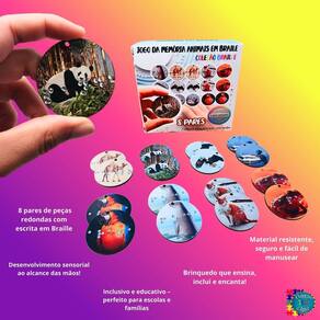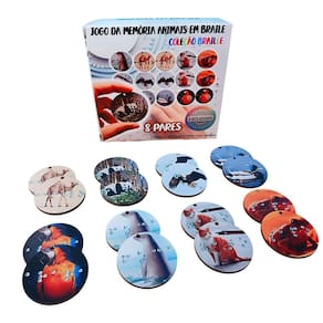 Destaques do produto: - 8 pares de peças redondas com imagens reais de animais e relevo em Braille feito com strass para fácil leitura tátil - Material resistente e acabamento seguro, ideal para manuseio contínuo - Estimula habilidades cognitivas, memorização e inclusão social - Formato exclusivo que alia educação, acessibilidade e diversão para todas as idades - Ferramenta prática para aprendizado do Braille, reforçando consciência sensorial e inclusão.