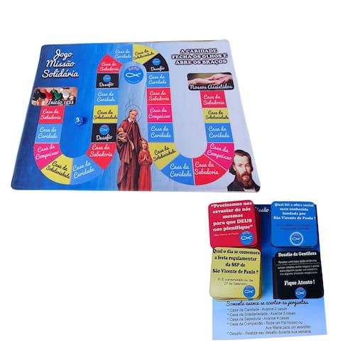 Conheça o jogo Educativo exclusivo Missão solidária SSVP São Vicente de Paulo, esse jogo foi criado para ajudar na educação das crianças e uma maneira lúdica de aprender sobre a SSVP e as CCAs, tudo feito com qualidade beleza e artes exclusivas criadas para esta coleção, e o mais importante: propósito. ao adquirir qualquer produto da nova coleção, você está ajudando diretamente os projetos sociais da SSVP em todo o Brasil, pois parte das vendas será doada para a SSVP.
