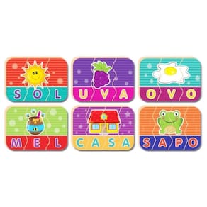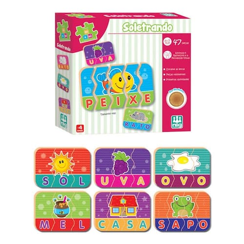 Brinquedo Jogo Educativo SOLETRANDO Alfabetização Infantil Quebra Cabeça BE A BÁ pedagógico 47 peças.Aprendendo a soletrar de forma divertida e criativa.Este brinquedo educativo é um jogo de montagem de palavras, através de quebra-cabeças.A brincadeira aborda a percepção visual infantil, na medida que a criança concilia as imagens na formação das palavras, usando seu raciocínio e criatividade. Também é um exercício de concentração.São 12 quebra-cabeças com 47 peças no total.Perfeito para as crianças brincarem juntas e aprenderem!As peças são todas em madeira reciclada e a pintura é feita na própria madeira, proporcionando assim mais durabilidade.ESPECIFICAÇÕES:Código de Barras: 7896200704182Idade Recomendada: A partir de 03 anosATENÇÃO: NÃO INDICADO PARA MENORES DE 3 ANOS POR CONTER PARTES PEQUENAS QUE PODEM SER ENGOLIDAS.Conteúdo da Embalagem: 47 PEÇAS EM MADEIRA.Medida Aproximada da Embalagem (A, L, C): 07x23x23cmGarantia: 30 dias