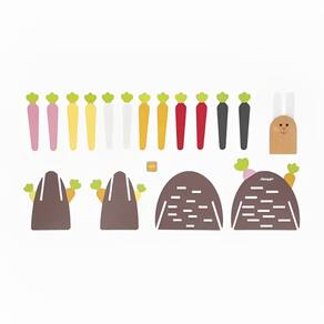 Conteúdo da Embalagem: 1 toca 1 coelho de madeira com orelhas de feltro 12 cenouras de madeira coloridas 1 dado de madeira