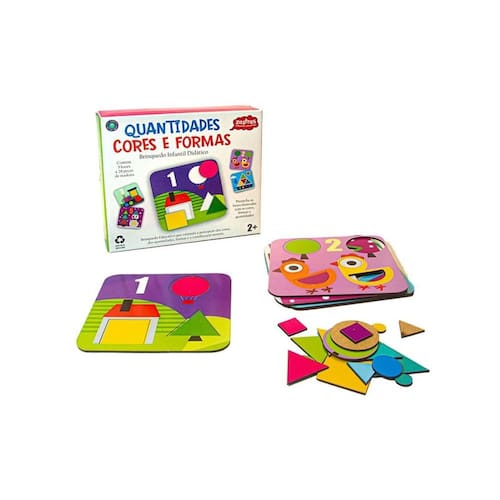 Brinquedo Educativo com figuras didáticas para a criança formar 5 cenários ilustrativos, criativos e divertidos! Escolha uma base ilustrativa e embaralhe as peças. Identifique em cada cenário a forma, a cor e a quantidade completando a ilustração com as peças correspondentes. Contém 5 base e 28 peças de madeira.