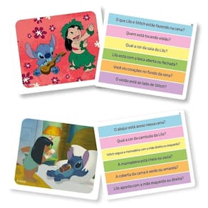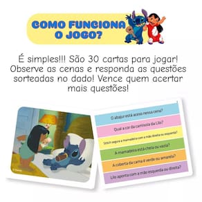 Observar as cenas por alguns minutos e responder ás questões sorteadas no dado, respondendo sobre Stitch, Lilo e suas aventuras. São 6 perguntas para cada cena. Esse jogo auxilia o aprendizado infantil, testando a memória e estimulando o desenvolvimento da linguagem. A criança vai nomear as figuras, trabalhando a fala e melhorando o vocabulário.