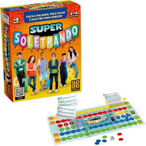 No Super Soletrando, uma carta é sorteada e o dado jogado para descobrir qual palavra você deve soletrar. O Jogador à sua esquerda lê a palavra em voz alta, e você entra em ação se acertar a soletração, joga o dado novamente e avança no tabuleiro para ficar mais perto da vitória. Precisa de ajuda Peças dicas, como uma explicação, um sinônimo ou até a primeira letra da palavra Divirta-se, aprenda e seja o primeiro a cruzar a linha de chegada neste desafio para toda a família