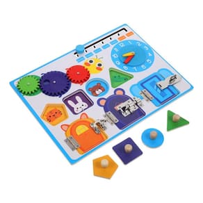 Com travas que não enferrujam facilmente e elementos como relógio, formas geométricas e dias da semana em inglês, o tabuleiro proporciona uma experiência educativa e divertida.