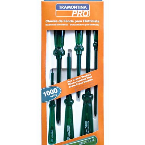 Jogo Eletricista 6 Peças Tramontina 44115406Características:1. As hastes das chaves de fenda são testadas em máquina de ensaio específica, para verificar o perfeito balanço entre resistência mecânica e dureza. 2. Os dimensionais das pontas são verificados com gabaritos-padrão calibrados e certificados, e a qualidade do fosfato é inspecionada ao microscópio. 3. As chaves de fenda isoladas são amplamente testadas, o que promove segurança na sua utilização em locais com tensões de até 1000 v ca. 4. Indicada para trabalhos em redes de tensão até 1.000 volts ca. 5. As ferramentas são produzidas e testadas conforme normas específicas.