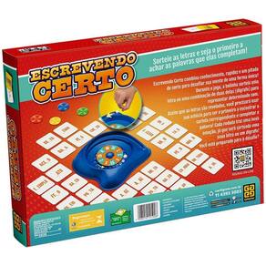 Escrevendo Certo combina conhecimento, rapidez e uma pitada de sorte para desafiar sua mente, de uma forma únicaDurante o jogo, a bolinha sorteia uma letra ou uma combinação de duas delas dígrafo para representar determinado som.Assim que as letras são revelasdas, você precisará usar sua astúcia para ser o primeiro a encontrar a cartela correspondente e completar a palavra Cada rodada traz uma nova emoção, já que será sorteada uma nova letra ou um dígrafoVocê está preparado para o desafioA partir de 7 anos 2 a 4 jogadoresTempo estimado de uma partida 20 minutos. Homologação Inmetro: CE-BRI/ICEPEX-N 01264-25-14