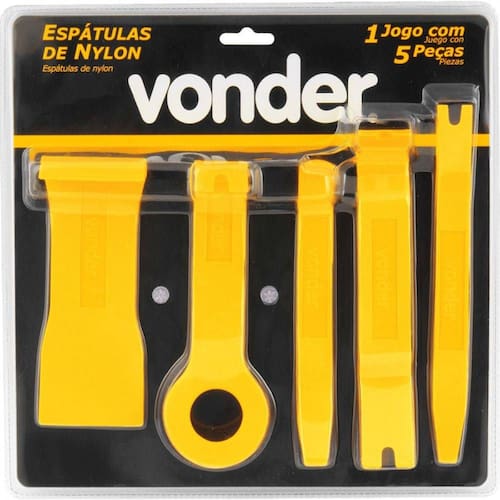 Jogo Espátula De Nylon 5 Peças Vonder Utilizado na desmontagem do interior de veículos, como: painéis, forros de portas, entre outros. Fabricado em nylon, proporcionando excelente resistência Material:Nylon Dimensões das espátulas comp. x larg. :Removedor acessível 195 mm x 30 mm , removedor de grampo para estofado 213 mm x 20 mm , removedor de grampo com puxador 180 mm x 30 mm , removedor de ângulo 175 mm x 20 mm , removedor largo 160 mm x 64 mm Conteúdo da Embalagem: 1 Jogo de espátulas, composto por: 1 removedor acessível, 1 removedor de grampo para estofado, 1 removedor de grampo com puxador, 1 removedor de ângulo e 1 removedor largo Ean: 7893946514860