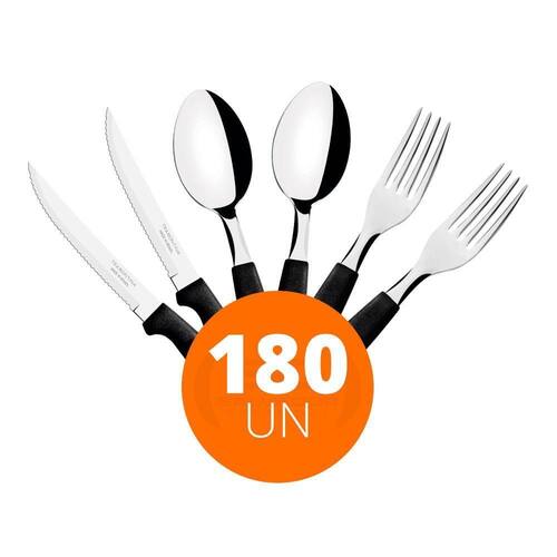 Componentes do KIT: - 60 Faca para Churrasco Ipanema com Lâmina em Aço Inox e Cabo de Polipropileno Preto 5 - Tramontina 23360405 - 60 Garfo de Mesa Ipanema com Lâmina em Aço Inox e Cabo de Polipropileno Preto - Tramontina 23362400 - 60 Colher de Mesa Tramontina Ipanema com Lâmina em Aço Inox e Cabo de Polipropileno Preto 23363400 - : 90 dias para vícios ou defeitos de fabricação - Ideal para Restaurante, Lancheria, Padaria, Linha Doméstica, Residência, Gourmet; - Seu cabo na cor preta é feito em polipropileno.; - Pode ir à máquina de lavar louças. - A lâmina de aço inox; Faca para Churrasco Ipanema com Lâmina em Aço Inox e Cabo de Polipropileno Preto 5 - Tramontina 23360405 - Peso Líquido: 0,023 kg. - Peso Bruto: 0,025 kg. - Dimensões Embalagem : 11cm A x 20cm L x 21,3cm P. - Dimensões Produto 12cm A x 22cm L x 22cm P. Garfo de Mesa Ipanema com Lâmina em Aço Inox e Cabo de Polipropileno Preto - Tramontina 23362400 - Peso Líquido: 0,025 kg. - Peso Bruto: 0,027 kg. - Dimensões Embalagem: 16cm A x 24cm L x 19cm P. - Dimensões Produto: 17cm A x 7,5cm L x 19cm P . Colher de Mesa Tramontina Ipanema com Lâmina em Aço Inox e Cabo de Polipropileno Preto 23363400 - Peso Líquido: 0,028 kg. - Peso Bruto: 0,028 kg. - Medidas Externas: 19cm x 4cm concha x 1,7cm Ean: 7890100022650