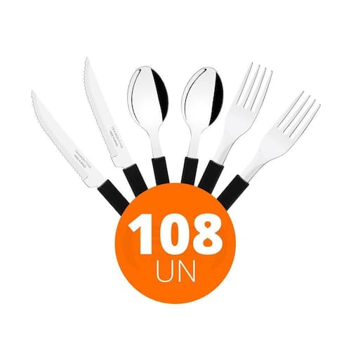 OBS: Veja na descrição os itens que acompanham o jogo. COMPONENTES DO KIT: 36 Faca para Churrasco Leme com Lâmina em Aço Inox e Cabo de Polipropileno Preto 4- Tramontina 23180404 36 Garfo de Mesa Leme com Lâmina em Aço Inox e Cabo de Polipropileno Preto - Tramontina 23182400 36 Colher de Sopa Leme com Lâmina em Aço Inox e Cabo de Polipropileno Preto - Tramontina 23183400 : 90 dias para vícios ou defeitos de fabricação; - Ideal para Restaurante, Lancheria, Padaria, Linha Doméstica, Residência, Gourmet; Faca para Churrasco Leme com Lâmina em Aço Inox e Cabo de Polipropileno Preto 4- Tramontina 23180404 - Pode ir à máquina de lavar louças facilitando seu dia a dia. - Peso Líquido: 0,016 kg. - Peso Bruto: 0,016 kg. - Dimensões Embalagem : 9cm A X 18cm L X 20cm P Garfo de Mesa Leme com Lâmina em Aço Inox e Cabo de Polipropileno Preto - Tramontina 23182400 - A lâmina de aço inox garante maior resistência devido a espessura do aço e a estampagem da lâmina. - Pode ir à máquina de lavar louças facilitando seu dia a dia. - Peso Líquido: 0,021 kg. - Peso Bruto: 0,025 kg. - Dimensões Produto: 13cm A x 23cm L x 18,5cm P. Colher de Sopa Leme com Lâmina em Aço Inox e Cabo de Polipropileno Preto - Tramontina 23183400 - A lâmina de aço inox garante maior resistência devido a espessura do aço e a estampagem da Lâmina. - Pode ir à máquina de lavar louças facilitando seu dia a dia. - Peso Líquido: 0,027 kg. - Peso Bruto: 0,029 kg. - Medidas Externas: 18,3cm x 3,9cm concha Marca: Não Informado