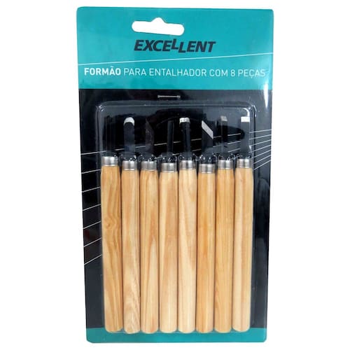 Jogo de Formão para Entalhador com 8 Peças, para trabalhos em madeira que requer precisão em peças delicadas. Marca: EXCELLENT Características: -Jogo com 8 peças. -Diversos formatos. -Cabo em madeira. -Fácil de usar. Conteúdo: -1 Jogo Para Entalhador com 8 peças. Aplicação: Ideal para entalhar madeira. Código: 6XQ Ean: 7895315001322