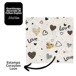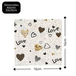 Este modelo possui estampa de corações preto e dourado sobre fundo branco, proporcionando uma composição visual leve, amorosa e divertida. Fabricado em papel tradicional, conta com folhas duplas, garantindo maior absorção e resistência no uso.