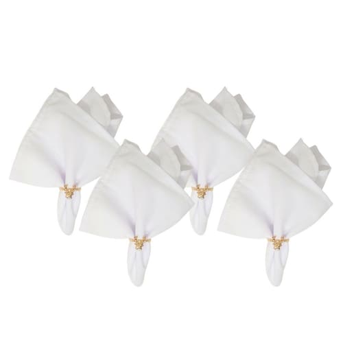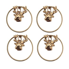 Jogo com 4 Argolas de Guardanapo com Pingente de Rena Natalina em Metal Rosê Gold + Guardanapos de Tecido Oxford Branco