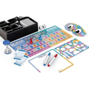 Contém: 1 Tabuleiro, 1 Gabarito com formas, 1 Tapa- olho, 1 Lousa para desenhar, 2 Canetas dry pen, 1 Ampulheta, 1 Baralho, 2 Peões, 2 Dados e 1 Regra.