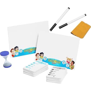 Componentes: 112 Cartas, 1 Ampulheta, 2 Quadros Plastificados, 2 Canetas de secagem rapida, 1 Apagador de tecido, 1 Regra.