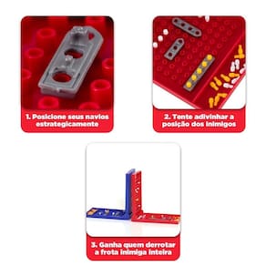 conteúdo da embalagem: 01 caixa azul, 01 caixa vermelha, 10 navios, 176 peças brancas e 44 peças amarelas. Dimensões aproximadas do produto: jogo montado: 14cm x 10cm x 29cm altura x largura x comprimento/profundidade