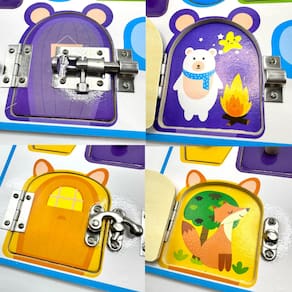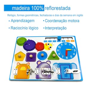 O Tabuleiro é um brinquedo educativo que estimula o aprendizado, o raciocínio lógico e a coordenação motora das crianças. Feito de madeira e metal com superfície lisa e borda redonda, é durável e seguro para as crianças brincarem. Com travas que não enferrujam facilmente e elementos como relógio, formas geométricas e dias da semana em inglês, o Tabuleiro proporciona uma experiência educativa e divertida.