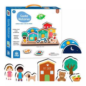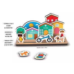 - O conjunto em madeira vem com 23 peças de carros, prédios e casas, árvores, animais de estimação e crianças mais uma base com ?trilhos? para as peças serem encaixadas e deslizarem.