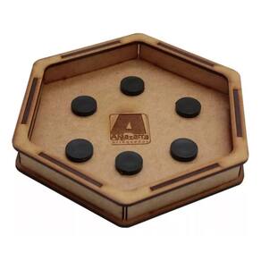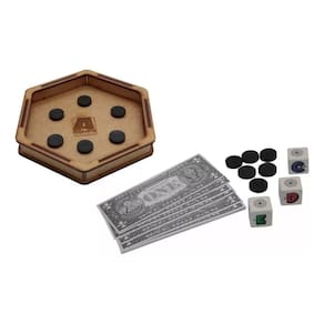 CONTEÚDO DA EMBALAGEM: 3 dados personalizados, 24 fichas, bandeja e dinheirinho