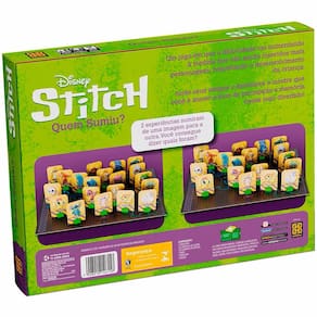 Jogo Infantil - Disney Stitch - Quem Sumiu? - Grow: um jogo em que a dificuldade vai aumentando à medida que vão sendo inseridos mais personagens, respeitando o desenvolvimento da criança. Junte seus amigos e familiares e mostre que você é atento e bom de percepção e memória nesse jogo divertido! 2 experiências sumiram de uma imagem para a outra. Você consegue dizer quais foram? Como jogar Quem Sumiu Stitch? 01) Para jogar, o líder lança o dado e, se o resultado for 0, passa a vez para o jogador à esquerda. Se o resultado for maior que 0, o líder coloca uma venda no jogador à esquerda, pede para ele virar de costas e retira do tabuleiro a quantidade de aliens indicada no dado 02) Em seguida, o líder esconde os aliens na caixa do jogo e dá o sinal para o jogador da vez 03) O jogador da vez deve retirar a venda, virar-se e identificar os aliens que sumiram 04) O jogador que acertar recebe os aliens que identificou e os mantém para si 05) Os aliens que não forem identificados voltam para o tabuleiro e uma nova rodada começa 06) O jogador que tiver mais aliens no final da partida vence Objetivo do Jogo: • Adivinhar qual é o personagem do seu oponente primeiro Informações: • Produto: Jogo Quem Sumiu? Stitch • Marca: Grow • Coleção: Disney-Stitch • Categoria: Jogos e Tabuleiros • Tipo de jogo: Jogo de Memória e Percepção • Objetivo: Identificar quais experiências sumiram de uma imagem para outra • Tempo médio de jogo: 15 minutos • Jogadores: para 02 a 04 participantes • Conteúdo: - 01 Tabuleiro - 20 cartelas de aliens - 20 suportes plásticos - 01 dado - 01 máscara - 01 manual de regras • Recomendação: para crianças a partir de 06 anos de idade Especificações: • Referência: 04615 • Código de Barras: 7908010146158 • Embalagem (C x A x L): 31.4 x 23.5 x 4.5 cm • Embalagem (Peso): 0.355 kg • Composição / Material: Papel, Papel Cartão e Plástico • Registro: CE-BRI/ICEPEX-N 01264-25 • Certificado: Órgãos Autorizados - OCP´S (Organismos de Certificação de Produtos) Aviso: • As imagens são meramente ilustrativas • Os pesos, tamanhos e medidas são aproximados • As cores e estampas dos produtos podem ter variações • As informações são de responsabilidade do fabricante ou fornecedor