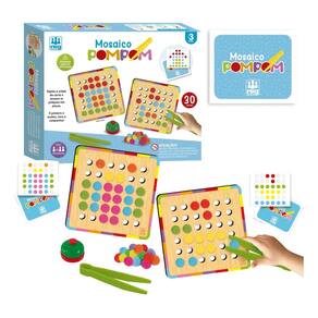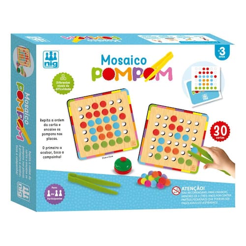 Contém: 2 Placas de madeira (21 x 21 cm), 2 Pinças plásticas, 30 cartas - figuras, 1 campainha, 112 pompons e 1 Instrução