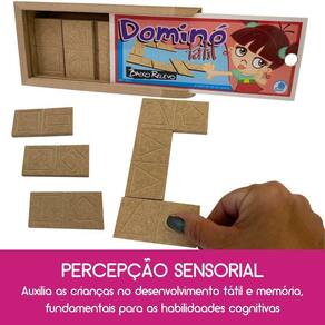 Jogo Infantil Educativo Sensorial Dominó Tátil Baixo Relevo Brinquedo Educativo Sensorial Dominó Tátil Baixo Relevo O uso deste jogo possibilita a percepção e interpretação por meio da exploração sensorial, trabalha coordenação motora fina e manuseio de forma uni e bimanual.