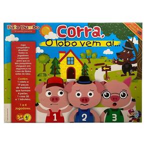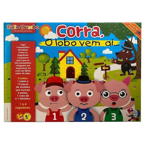 Jogo infantil em madeira corra, o lobo vem ai. . . . Jogo infantil em madeira corra, o lobo vem ai. . . . Divertido jogo cooperativo onde os participantes ajudam os três porquinhos a chegar na casa de tijolos antes do lobo. Gire a roleta para mover os porquinhos em direção à casa, mas cuidado: ao girar o lobo também pode avançar casas e acabar entrando pela porta dos fundos. Este jogo trabalha o reconhecimento das cores, o contar histórias e trabalho em equipe, podendo ser jogado entrre 2 a 4 jogadores. Corra, o lobo vem ai é um jogo simples que leva cerca de 10 minutos para ser jogado. - marca: bate bumbo - dimensões: 40 x 30 x 5,5 cm - e lacrado - contém: 1 roleta, 19 peças em madeira que formam 4 peões, 1 casa 3 d e um tabuleiro. - faixa etária: indicado para crianças à partir de 3 anos. - ean: 7898927097578 - certificado pelo inmetro ce-bri/brics 01319-20 nm 300/2002 segurança do brinquedo