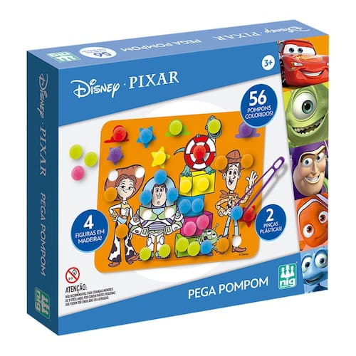 Benefícios: Com personagens icônicos – Inclui figuras ilustradas dos filmes Monstros S.A., Up, Toy Story e Procurando Nemo, tornando a brincadeira mais envolvente. Desenvolvimento completo – Trabalha coordenação olho mão, reconhecimento de cores, criatividade, paciência e raciocínio lógico. Sustentável e resistente – Placas fabricadas com madeira, oferecendo mais durabilidade e respeito ao meio ambiente. Diversão com propósito – Uma brincadeira educativa que pode ser feita individualmente ou em dupla, desafiando as crianças a completar seus quadros com agilidade e precisão. Peças seguras e fáceis de manusear – Pompons macios e pinças plásticas desenvolvidas especialmente para as mãozinhas dos pequenos.