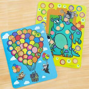 Conteúdo da embalagem: 04 placas ilustradas em madeira com personagens Disney Pixar 56 pompons coloridos 02 pinças plásticas