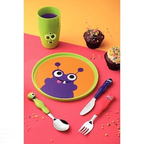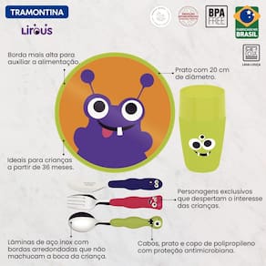 Para deixar a alimentação das crianças mais dinâmica e divertida, conte com o jogo infantil Tramontina Lirous colorido 05 peças. Seus talheres são desenvolvidos com lâminas em aço inox e cabos de polipropileno, ambas características que os deixam mais resistentes e duráveis. E ainda conta com um lindo prato e copo de pollipropileno. Todos eles contam com proteção antimicrobiana, inibem o crescimento de fungos e bactérias, deixando a refeição das crianças ainda mais segura! Orientações Lâminas de aço inox com bordas arredondadas que não machucam a boca da criança.Os cabos, copo e prato de polipropileno possuem maior resistência e durabilidade.Prato com borda mais alta para auxiliar a alimentação, evitando que a comida saia do prato. Produtos com proteção antimicrobiana que inibem o crescimento de fungos e bactérias, proporcionando benefícios em higiene e redução de microorganismos que causam contaminação.Podem ir a máquina de lavar louças, facitando a limpeza. Produtos Livre de BPA: O Bisfenol-A é um componente químico usado na produção de alguns plásticos como o Policarbonato. Este componente pode ser prejudicial à saúde e por isso a Tramontina não o utiliza em seus produtos. Características Gerais EAN13 7891112299498 DUN14 17891112299495 NCM 3924.10.00 Peso Líquido 0,2300 kg. Peso Bruto 0,3350 kg. Metragem 0,011718 m³. Dimensões Embalagem (Compr. X Larg. X Alt.) 300x 84x 465 mm. Observações Recomenda-se o uso destes produtos para crianças com 36 meses ou mais. Tenha cuidado ao manusear a faca e o garfo por serem produtos cortantes e perfurantes. Antes da primeira utilização, lave bem as peças e seque-as. Estes produtos podem ir à máquina de lavar, porém não recomendamos usar produtos abrasivos como saponáceos, esponjas rígidas ou palhas de aço. Seque-os bem antes de guardar. O prato e o copo podem ser utilizados no micro-ondas para aquecimentos breves de, no máximo, 3 minutos. Para descarte dos produtos e embalagem siga as orientações de reciclagem vigentes. Atenção: Por razões de segurança e saúde do seu filho, utilizar sempre os produtos com supervisão de um adulto. Não utilize os produtos caso apresentarem dano ou defeito. Verifique sempre a temperatura do alimento antes da alimentação.