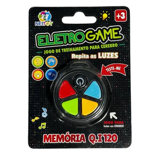 Idade recomendada: + 03 Anos.https://youtu.be/nHVSH_tJhrw Eletrogame Q.I 120 Memória é um brinquedo interativo que desafia a memória e os reflexos do jogador. Ele emite sequências de luzes e sons, e o jogador precisa repetir as sequências corretamente para avançar no jogo.