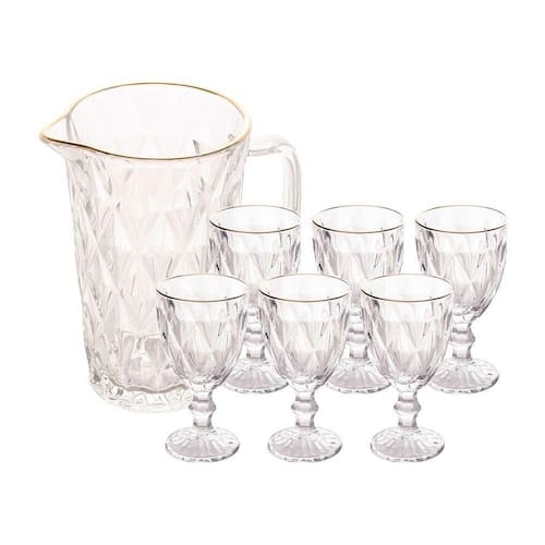 Jogo Jarra 1L Diamond com 6 Taças de Vidro 325ml Fio de Ouro Borda Dourada Água Suco Lyor