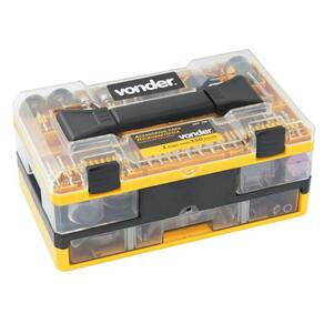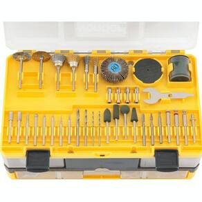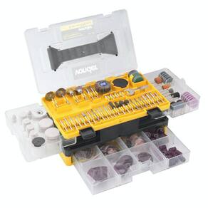 1 Jogo de acessórios para microrretífica, composto por: 1 disco diamantado, 30 lixas cilíndricas, 2 rodas de pano, 12 rodas de feltro, 2 pontas com feltro, 1 roda de borracha, 4 limas rotativas, 2 hastes para lixas cilíndricas, 11 limas rotativas diamantadas, 3 pontas montadas de óxido de alumínio, 6 rebolos de óxido de alumínio, 3 pontas montadas de carbureto de silício, 6 rebolos de carbureto de silício, 3 escovas de inox, 3 escovas de latão, 1 pasta para polimento, 108 discos de corte, 135 discos de lixa, 4 pinças para microrretífica, 1 haste para discos de corte, 1 haste para discos de borracha, 1 haste para discos de lixa, 1 haste para discos de feltro, 2 discos de corte de fibra de vidro, 1 chave para microrretífica, 1 roda de lixa (grão 80), 1 bastão abrasivo e 4 pontas montadas de borracha