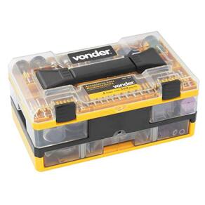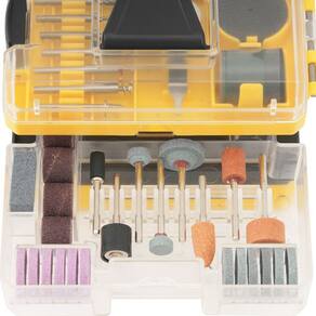 1 Jogo de acessórios para microrretífica, composto por: 1 disco diamantado, 30 lixas cilíndricas, 2 rodas de pano, 12 rodas de feltro, 2 pontas com feltro, 1 roda de borracha, 4 limas rotativas, 2 hastes para lixas cilíndricas, 11 limas rotativas diamantadas, 3 pontas montadas de óxido de alumínio, 6 rebolos de óxido de alumínio, 3 pontas montadas de carbureto de silício, 6 rebolos de carbureto de silício, 3 escovas de inox, 3 escovas de latão, 1 pasta para polimento, 108 discos de corte, 135 discos de lixa, 4 pinças para microrretífica, 1 haste para discos de corte, 1 haste para discos de borracha, 1 haste para discos de lixa, 1 haste para discos de feltro, 2 discos de corte de fibra de vidro, 1 chave para microrretífica, 1 roda de lixa grão 80 , 1 bastão abrasivo e 4 pontas montadas de borracha