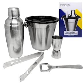 Jogo kit bar em inox com coqueteleira balde de gelo abridor Este elegante conjunto de bar jogo bar inox com coqueteleira 5 peças, é a escolha perfeita para servir seus amigos e familiares com estilo e facilidade. O conjunto é composto por cinco peças essenciais para qualquer bar: um balde de 1,2 litros, uma coqueteleira de 350ml, um dosador de 25/50ml, um pegador e um abridor. O modelo inox adiciona um toque de sofisticação a qualquer ambiente. Este conjunto é uma adição perfeita para o seu bar em casa ou um presente maravilhoso para os amantes de coquetéis.
