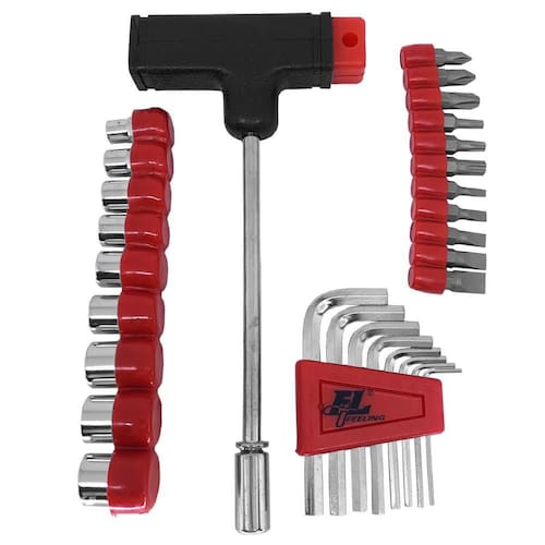 Descrição do Produto: Jogo Kit Chaves Fenda Soquete Tipo T Ferramentas 30 Peças Feeling Esse Kit Chave T com Phillips e Fenda, possui a chave em "T", que é mais eficiente e confortável. devido ao cabo ergonômico. Chave tipo T com soquetes. Fabricado em aço especial de alta qualidade. Super reforçado. Cabo plástico. Indicado para sempre ter em mãos a ferramenta certa para qualquer ocasião. ou doméstico. - 1 Chave T: 180mm - 3 Pontas Philips: 1 - 2 - 3 - 3 Pontas Torx: T15 - T20 - T30 - 5 Pontas Fenda: 3- 4 - 5 - 6 - 8 mm - 8 Chaves Allen: 1,5 - 2 - 2,5 - 3 - 4 - 5 - 5,5 - 6 mm - 9 Soquetes: 5 - 6 - 7 - 8 - 9 - 10 - 11 - 12 - 13 mm - 1 Adaptador de bits