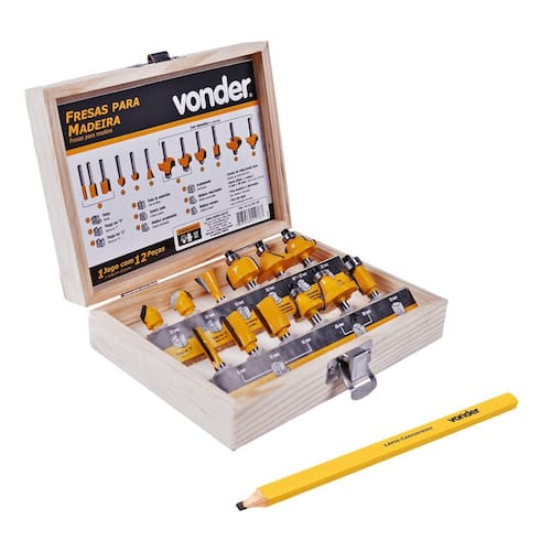 Jogo Kit De Fresas 12 Peças Vonder Para Tupia E Lápis Conteúdo da embalagem: -1 jogo com 12 peças. -3 fresas retas 6 mm, 12 mm e 16 mm ; -1 fresa para rasgo em v 12 mm ; -1 fresa para rasgo em u 12 mm ; -1 fresa rabo de andorinha 12 mm ; -2 fresas com rolamento de 9 mm para quebrar canto 25 mm e 30 mm ; -1 fresa com rolamento de 12,7 mm para acabamento em lâminas 12 mm ; -1 fresa com rolamento de 9 mm para moldura arredondada 22 mm ; -1 fresa com rolamento de 9 mm para moldura reta/chanfro 45° 32 mm ; -1 fresa com rolamento de 9 mm para moldura romana 25 mm , indicado para trabalhos em madeira e derivados; -lápis carpinteiro vonder. Marca: Não Informado Ean: 7909463106379