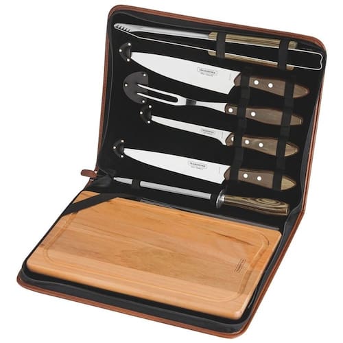 Kit Para Churrasco Inox Tramontina 8 Peças Polywood 21198/765 Conteúdo: 1 - 21175/040 - Pegador para carne 37 cm 1 - 21188/046 - Faca para desossar 6 1 - 21189/048 - Faca para carne 8 1 - 21190/048 - Faca para carne 8 1 - 21192/040 - Garfo trinchante 1 - 21193/048 - Chaira 8 1 - Tábua de madeira 37x23 cm 1 - Estojo sintético Descrição: Respeito também se conquista na ponta da faca. Mas, calma. Estamos falando da linha de facas e garfos trinchantes especiais para churrasco. A Tramontina tem um modelo para cada etapa do preparo: da limpeza dos cortes até a hora de servir a carne já churrasqueada. Todas com o corte perfeito que o seu churrasco merece. Haste em aço carbono revestida com cromo-duro. Láminas de aço inox. Cabos de madeira tratada Polywood. Rebites de alumínio. Tábua de madeira. Estojo sintético. Uso seguro: Tenha cuidado ao manusear produtos cortantes e perfurantes e mantenha-o fora do alcance das crianças. Para maior durabilidade dos produtos recomenda-se secar bem antes de guardar, mesmo após lavagem em máquina. Uso seguro e adequado: Antes do primeiro uso, lave o produto com esponja macia, sabão ou detergente neutro. Seque com toalha de pano. Após cada uso, lave e seque o produto conforme instrução acima. Guarde em locais arejados evite ambientes abafados como gavetas e armários . Não lave o produto em lava-louças nem utilize esponja de aço. Não deixe o produto submerso em água. Não deixe o produto secar ao sol, nem deixe secar em pé, na pia. Não empilhe peças quando estiverem úmidas. Não leve o produto ao forno ou geladeira. Complemento: EAN13: 7891112175105 DUN14: 17891112175102 NCM: 8211.10.00 Peso Líquido: 3,1000 kg. Peso Bruto: 3,1700 kg. Metragem: 0,008161 m Dimensões Embalagem Compr. X Larg. X Alt. : 405x 325x 62 mm. Dimensões Produto Compr. X Larg. X Alt. : 405x 325x 62 mm. Ean: 7891112175112