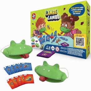 Ficha Técnica: Nome do produto: Jogo Lambe Lambe; Marca: Estrela; Idade recomendada: A partir de 5 anos; Selo Inmetro: 012 346/2023; Inclui: 2 máscaras de sapo, 2 elásticos, 4 línguas de sogra de plástico, 10 cartas de jogo com abertura inferior, 10 cartas de monte e 1 saco zip.