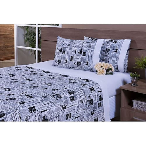 Jogo lençol 4 peças cama viúva 180 fios estampa de jornal barrado branco Jogo de lençol 4 peças cama 2,03 x 1,20 x 0,30 cama viúva 100% algodão 150 fios 01 lençol de cima 2,60m x 1,90m estampado de jornal 01 lençol de baixo com elástico ao redor de todo o lençol para melhor fixação no colchão não fica saindo da cama para colchão 2,03 x 1,20 x 0,30 cor lisa branco 02 fronhas 70cm x 50cm estampado de jornal Composição: tecido 100% algodão 180 fios Marca: Mtr Enxovais Ltda