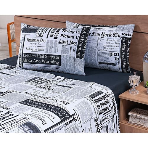 Jogo Lençol 4 Peças Cama Viúva 2,03mx1,20mx35cm 100% Algodão 180 Fios Ponto Palito Jornal Preto