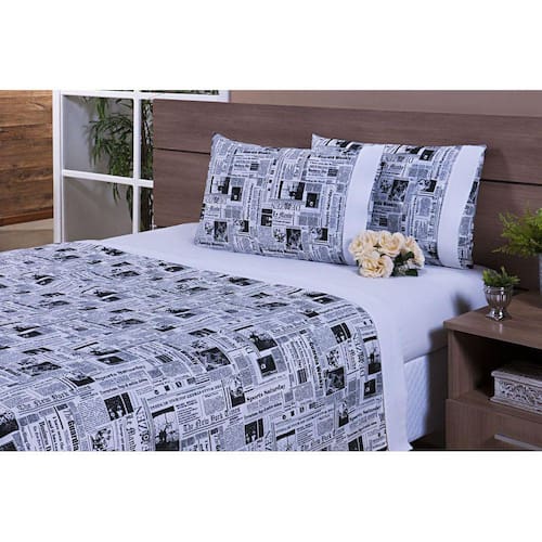 Jogo lençol 4 peças cama viúva 1,88m x 1,28m x 30alt percal 150 fios estampa de jornal barrado branco Thais enxovaisJogo de lençol 4 peças cama 1,88 x 1,28 x 0,30 cama viúva 100% algodão 150 fios 01 lençol de cima 2,60m x 1,90m estampado de jornal01 lençol de baixo com elástico ao redor de todo o lençol para melhor fixação no colchão não fica saindo da cama para colchão 1,88 x 1,28x 0,30 cor lisa branco02 fronhas 70cm x 50cm estampado de jornalComposição: tecido 100% algodão 150fios Marca: Thais Enxovais
