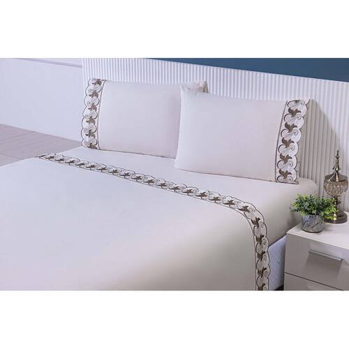 Jogo lençol casal viúva 2,03mx1,20mx30cm 4 peças 180 fios 100% algodão barrado bordado tulipa cáqui Jogo de lençol casal viúva 4 peças 100% algodão 180 fios com barrado bordado richilieu