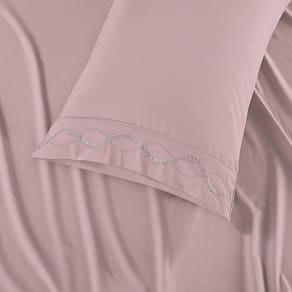 O Jogo de lençol para cama King com 04 peças confeccionado em tecido Percal 300 fios, detalhes em bordado na fronha e no lençol de cima. Possui alto padrão de qualidade, proporciona conforto e sofisticação.